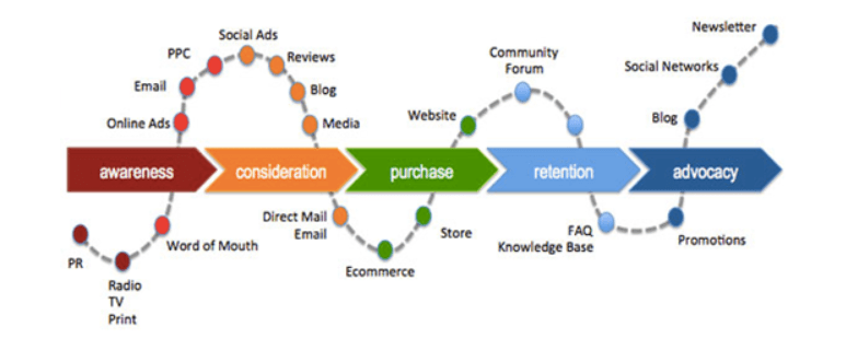 Básicamente, se entiende que el Customer Journey de un cliente se resume en cinco etapas: